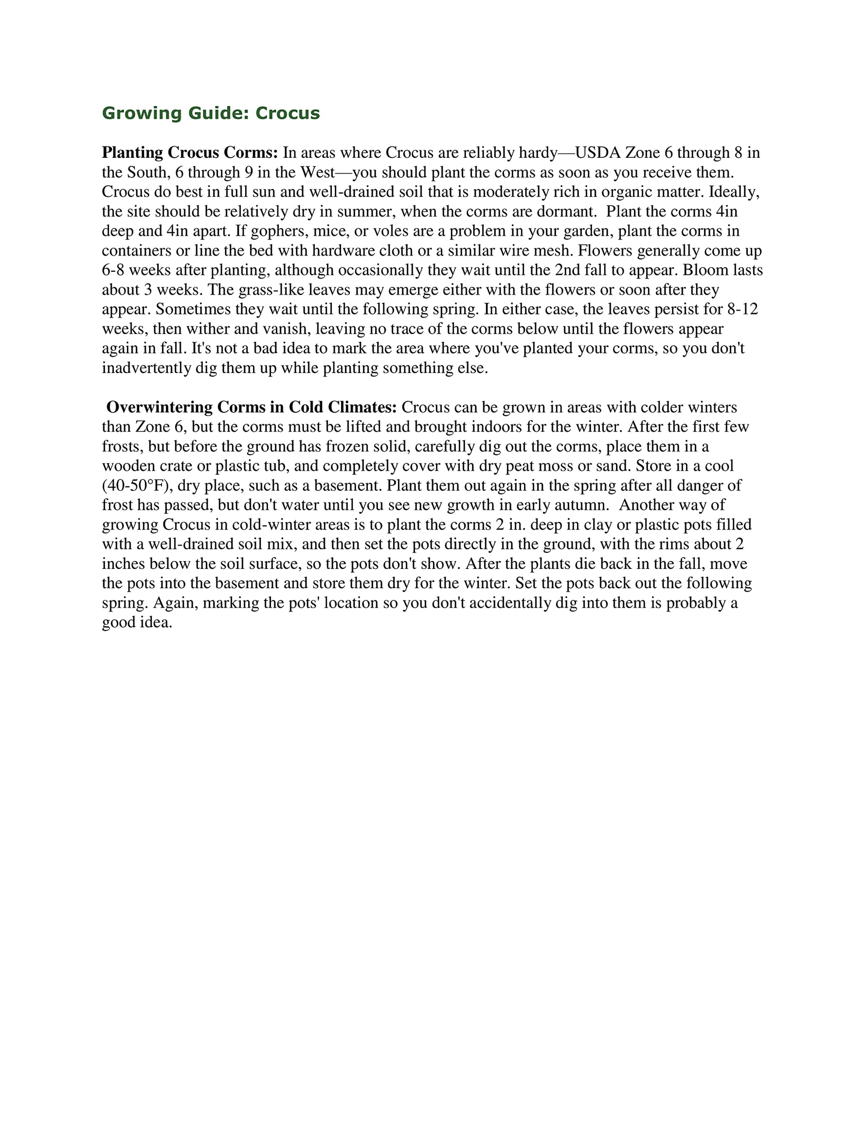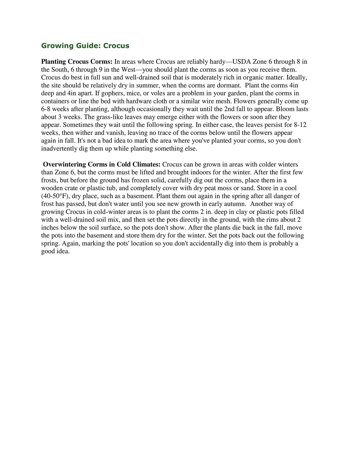 Grass-like foliage surrounds these beautiful yellow, purple, and white chalice shaped flowers. Full Sun, Partial Shade 4"-6" Tall Blooms early spring Zone 3-9 Carefree and naturalizing; these bulbs signal the end of winter. Crocus are easy to grow in well-drained soil in full sun or partial shade. Plant in waves in the garden or lawn. If planting in the lawn wait at least 6 weeks after the crocus have flowered to mow the lawn. Crocus will multiply and come back year after year if left undisturbed. All of our products are packaged with official Daylily Nursery materials and have copyrighted growing instructions.