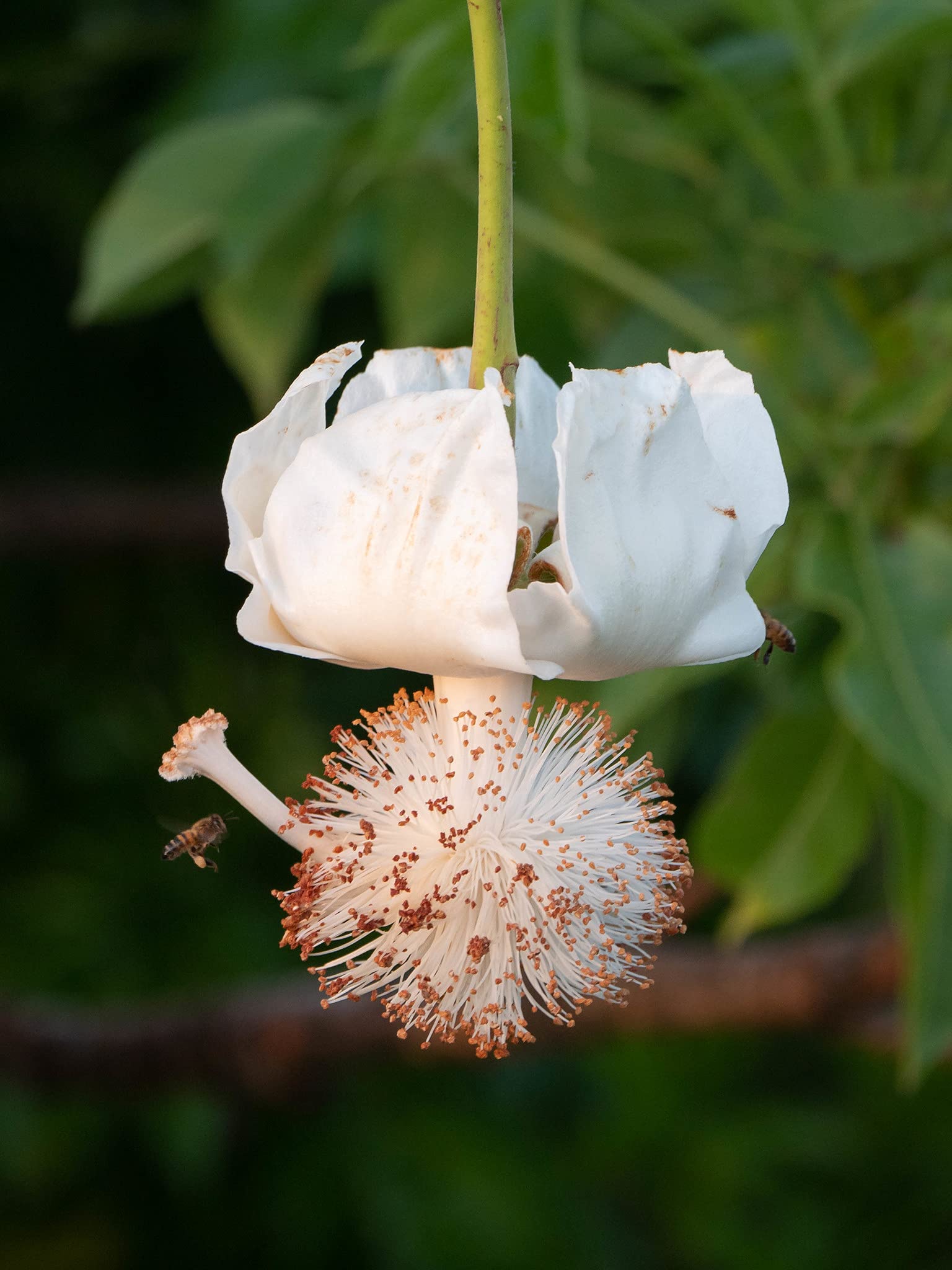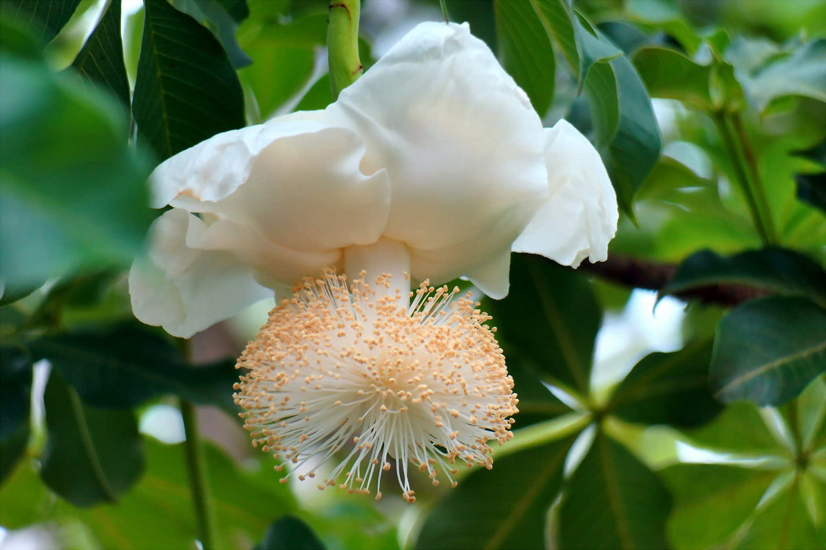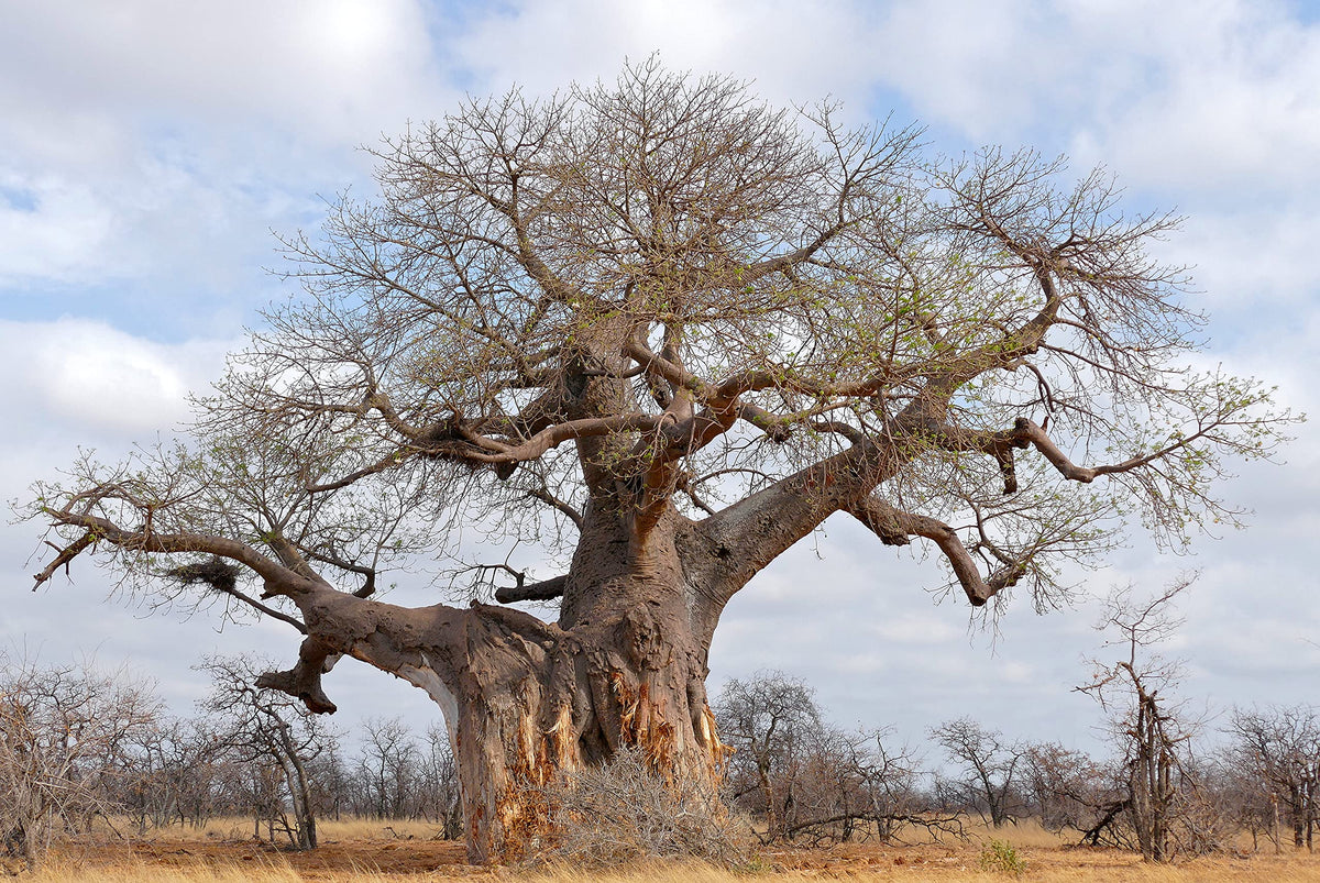 Surely one of the most unusual trees on earth, the African Baobab is elephant-like in a land of elephants, with a vastly stocky trunk and humanoid branches. Bears pendulous, giant, white-winged flowers that sport globular arrays of yellow-tipped stamens and give way to the velvety, elongated fruits. These fruits contain a powdery pulp, rich in citric and tartaric acid (also quercetin), that makes a refreshing, tart, astringent drink. The young leaves of the tree are steamed and eaten as a nutritious food. The bark is twisted into fiber and used in basketry or rope making. The plant prefers dry conditions, well-drained soil and tolerates full sun. A rarity in domestic culture. The African baobab (Adansonia digitata L.) is one of the eight species of baobab (Adansonia) and the only one native to mainland Africa. Like other baobabs, the African baobab is a massive deciduous fruit tree, up to 20-30 m high, with a lifespan of several hundred years. Its swollen and often hollow trunk looks like a huge bottle and can be as broad as 3-7 m in diameter. It bears short, stout and tortuous branches and has a thin canopy. Baobab is strongly anchored in the soil by an extensive and strong root system that grows 2 m deep, and whose diameter may be higher than the tree height. The leaves are simple or digitally compound, dark-green on top, and borne at the end of a 16 cm-long petiole. The leaflets are between 5-15 cm long and 1.5-7 cm broad. The baobab shed its leaves during the early dry season and new leaves appear after flowering. The pentamerous flowers are white, large (20 cm in diameter and 25 cm long), and hang from stalks on pedicels up to 90 cm long. The fruit is a voluminous (35 cm long and 17 cm in diameter) ovoid capsule with a hard, woody envelope containing a pulp and black seeds. Once ripe, the fruit envelope becomes brittle and the pulp takes on a chalky consistency. The baobab is mainly used for food. The fruits, flowers, leaves, shoots, roots of seedlings an