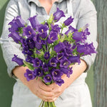 BLUE BELLFLOWERS: Campanula makes a nice addition to a cut flower production in that it offers a bountiful crop in spring to early summer, often in the gap between early spring crops and summer annuals. Stems are sturdy and add structure, bulk, and visual interest to bouquets. Seed has been coated with conventional pellet for ease of sowing.