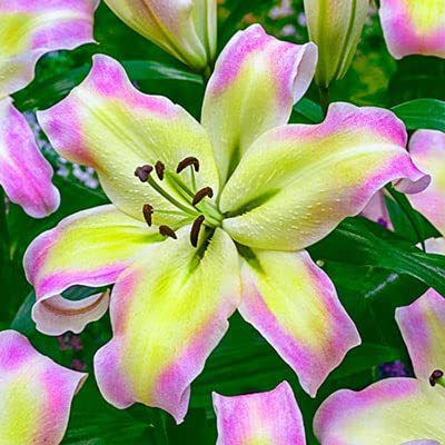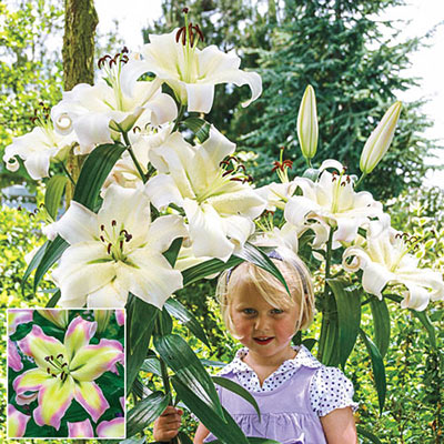 A beauty in the garden and cut-flower displays, Giant Orienpet Lily Pretty Woman features up to 8" flowers that start yellow-pink and change to creamy white. Their fragrance perfumes the summer air. Pretty Woman is a cross between the exotic Orientals and regal trumpet lilies. Orientals are known for their fragrance, spectacular color and flower size. Trumpets are known for their trumpet-shaped flowers, they naturalize well and are easy to grow. The sturdy stems on these lilies can reach a height of 3-4', with large, sweet-smelling blooms 3-6" in size in the first year alone. By the second year, they can shoot up to 5-6', and within three years these lilies can reach as high as 6-8' with masses and masses of beautiful blooms to enjoy. The surge in height of these lilies is owed to their extraordinary ability to produce multiple stems from a single bulb.