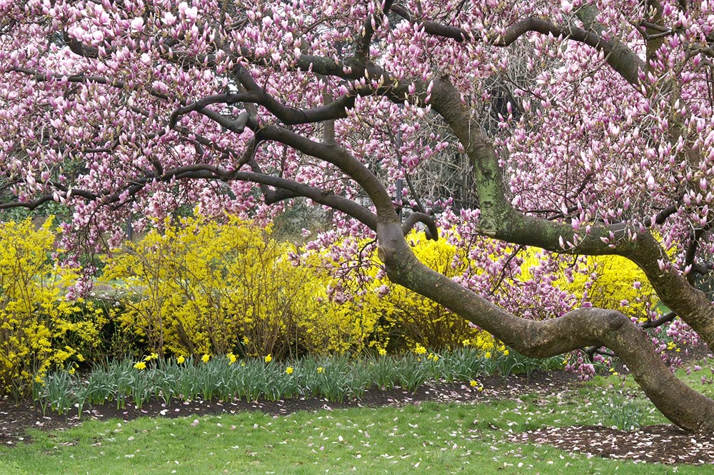 10 Seeds. Magnolia × soulangeana has alternate, simple, shiny, dark green oval-shaped leaves on stout stems. Its flowers emerge dramatically on a bare tree in early spring, with the deciduous leaves expanding shortly thereafter, lasting through summer until autumn. Magnolia × soulangeana flowers are large, commonly 10-20 cm (4-8 in) across, and colored various shades of white, pink, and maroon. An American variety, 'Grace McDade' from Alabama , is reported to bear the largest flowers, with a 35 cm (14 in) diameter, white tinged with pinkish-purple. The exact timing and length of flowering varies between named varieties, as does the shape of the flower. Some are globular, others a cup-and-saucer shape.