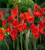 Truly a bold canna favorite! Very striking with dazzling scarlet blooms and dark-green leaves. Lovely grown in masses. In late summer when bold flowers are scarce enjoy these, warm, flamboyantly colored flowers. These fiery blooms are eye-catching from across the garden (just ask the hummingbirds)! Perfect for the middle of a border or in a pot to brighten up any garden or patio. Cannas bring a touch of the tropics to wherever they are planted. These exotic looking plants are indispensable for a splendid summer border bursting with drama. Their size, bright, showy flowers and foliage patterns ensure that your Cannas will stand out. Large, exotic looking plants with beautiful flowers and decorative foliage. Makes a great centerpiece in bedding schemes and large containers. As soon as a stalk has finished blooming, remove it and a new one will take its place. If faded flowers are not removed, seeds will form and flowering will cease.