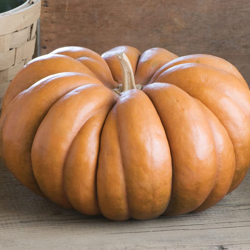 Long Island heirloom. Medium-large, flattened, medium-ribbed, suggesting a wheel of cheese. Smooth, tan skin, slender woody stem. Deep orange, moderately sweet flesh for pie. Long storage. A beautiful oldie.