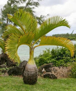 The Bottle Palm is a well-known and very popular ornamental for tropical and warm subtropical regions. It was once common on Mauritius in the Mascarene Islands but although commonly cultivated, its wild stands are reduced to a few handful of plants on tiny Round Island north of Mauritius. It produces a curiously swollen trunk, the shape of which is somewhat reminiscent of a champagne bottle. The crown holds up to five leathery, pinnate fronds supported by a slender, waxy crownshaft. The Bottle Palm grows fairly slowly but is a tough plant that can take drought and coastal conditions without a problem.