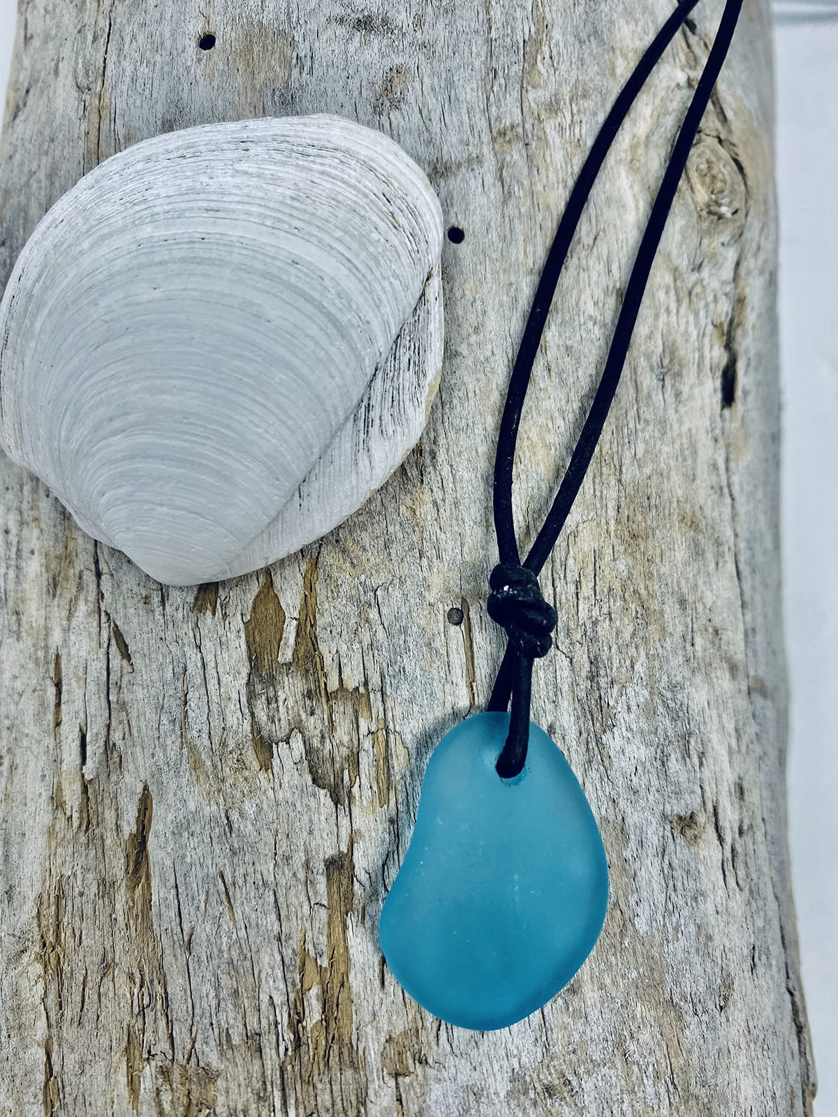 Stunning handmade sea glass necklace with antique leather cord. Made with love in Iowa, a necklace made of blue sea glass is believed to bring good luck. Hawaii style, boho, coastal jewelry.