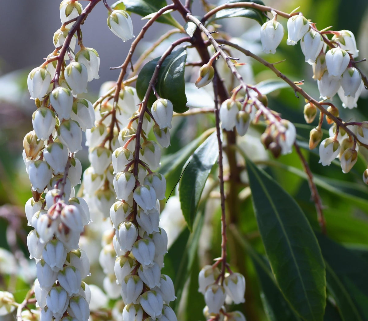 Pieris japonica is a shrub with alternate, simple leaves , on brittle stems. The flowers are white, borne in early spring. A poisonous plant if consumed by people or animals. The name "andromeda" originated in the genus where the plant was formerly placed.