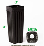 10 Plastic Tree Pots for Optimal Growth: 8-inch deep, 3-inch wide top, ideal for budding, grafting, and starting larger seedlings. Durable square design with 20% increased root growth potential, deep root system, and space-saving. Prevents spiraling with vertical training ribs. Comes with a large drainage hole."