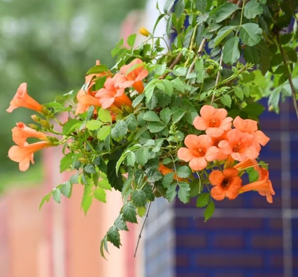 Trumpet Vines are an old-fashioned favorite. It’s a vigorous, woody vine with large, 3" trumpet-like orange flowers in summer and fancy cut leaves. If you’re looking to attract hummingbirds, this is the vine to plant, as they’re attracted to the bright blooms. After the trumpet vines bloom, they’re preceded by long, bean-like seed pods that split and release two-winged seeds that blow in the wind. This vine is easy to establish and grows luxuriantly. It will cover any structure and can grow up to 30-40' high when allowed to climb!